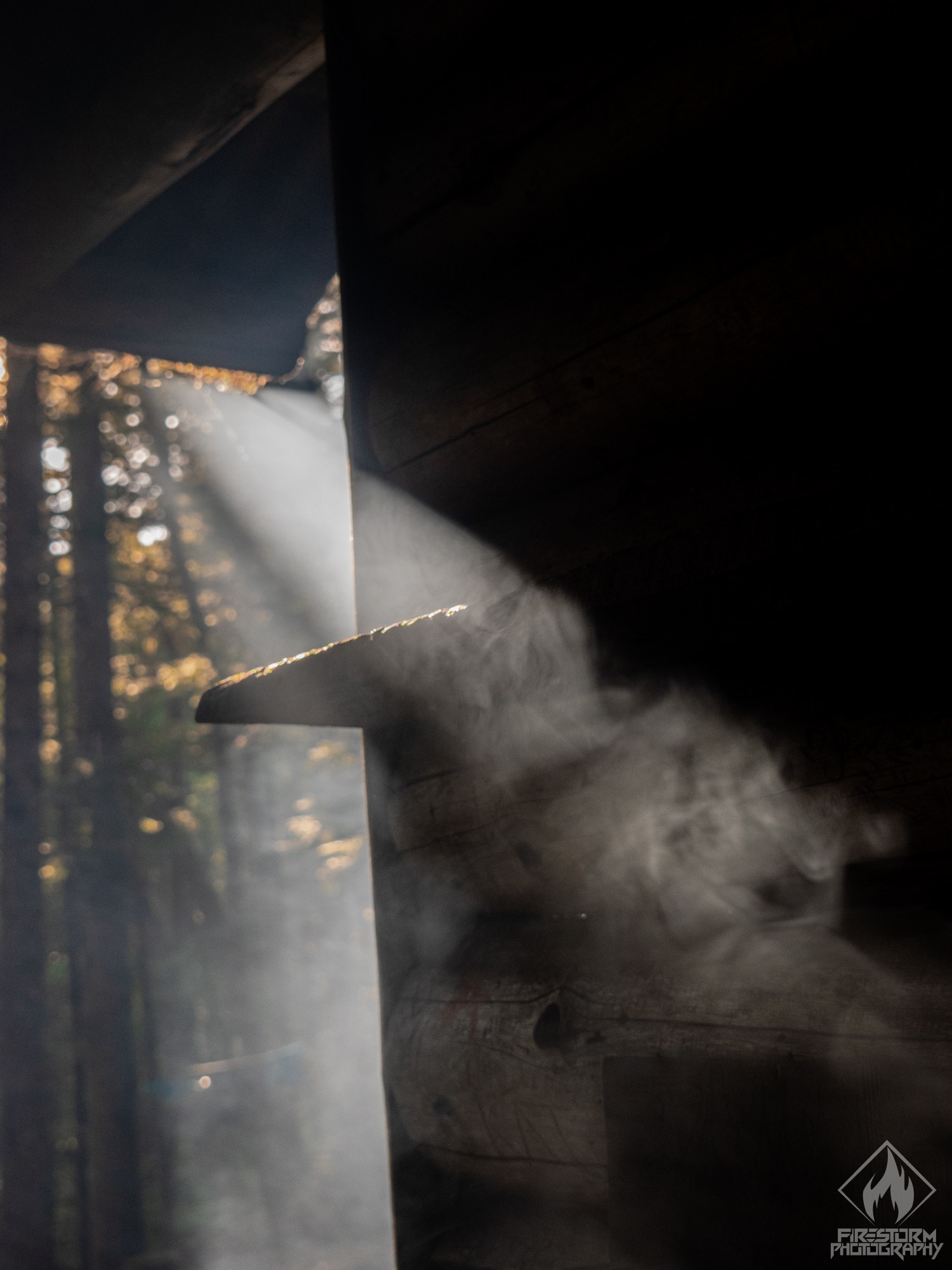 3 – Sun shining into a lean-to through thick campfire smoke