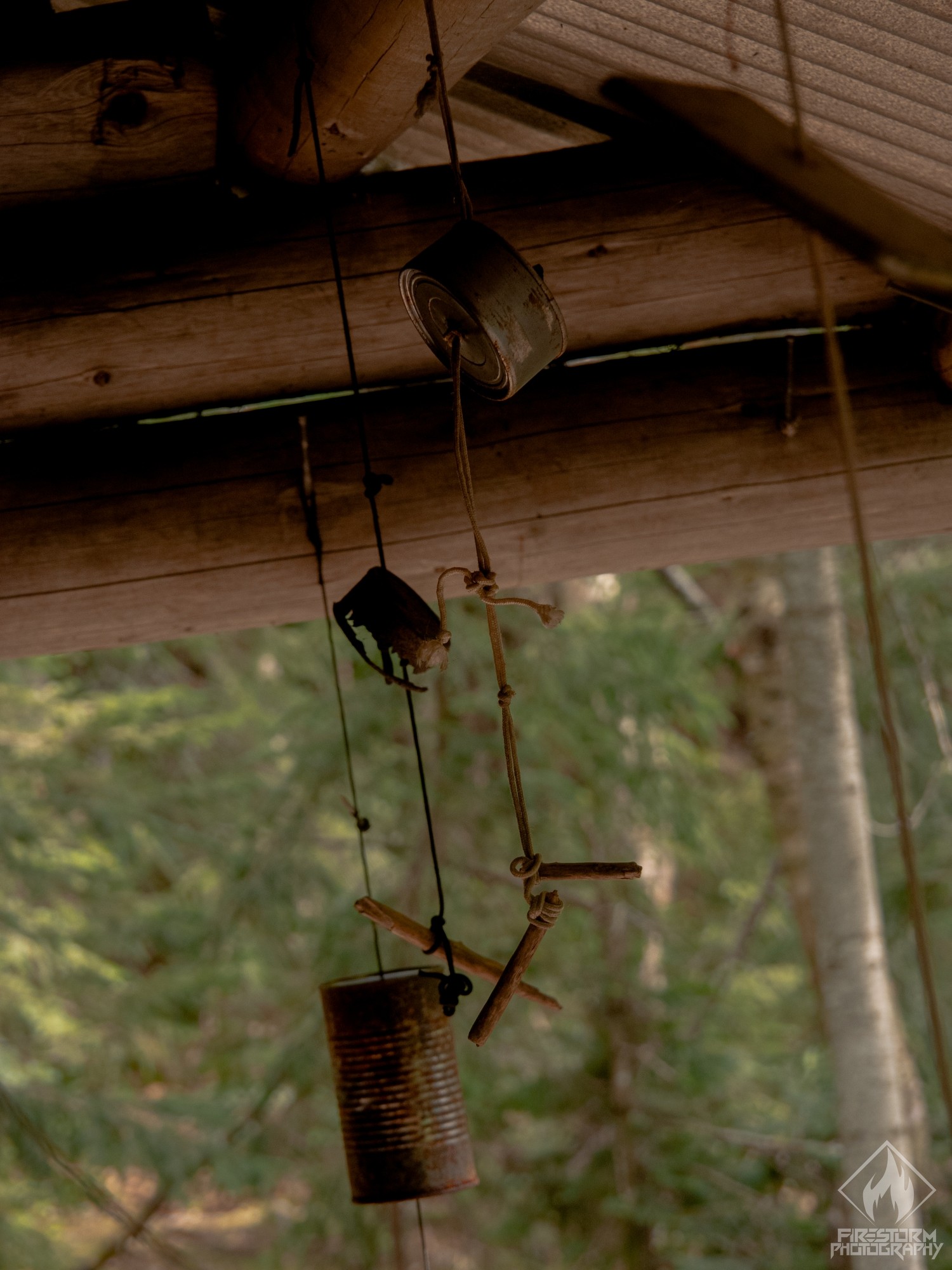 6 – Ornaments made of paracord, sticks, and old cans, hanging in a lean-to